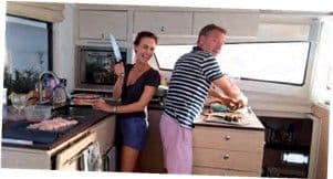 My main activity on board revolves around the galley, my kingdom: I must admit that the large U-shaped galley with lots of storage, the gas barbecue and my wine cel- lar, all make my life easier. And the American fridge-freezer with over 600 liters capacity is an incredible comfort on a cat, and it also means we won’t have to run ashore to revictual immediately on arrival in St Lucia.